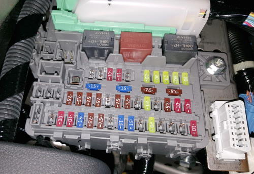 W kabinie jednostka główna z bezpiecznikami i przekaźnikami umieszczona jest pod deską rozdzielczą po stronie kierowcy.