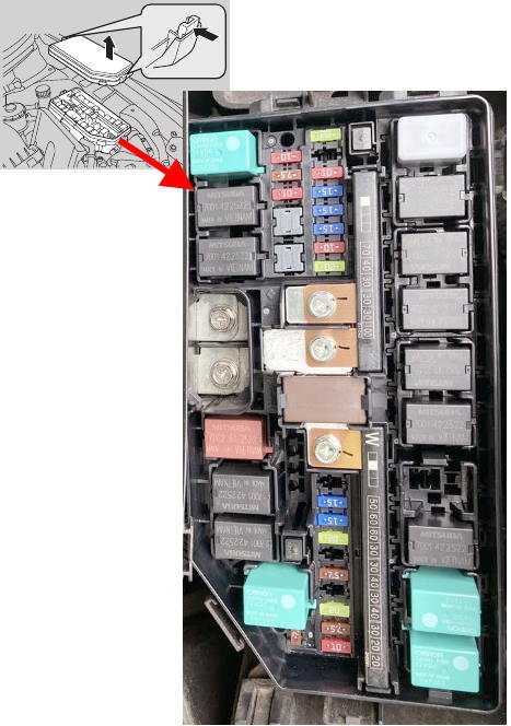 Pod maską, po lewej stronie, znajduje się jednostka główna z bezpiecznikami i przekaźnikami, przykryta pokrywą ochronną.