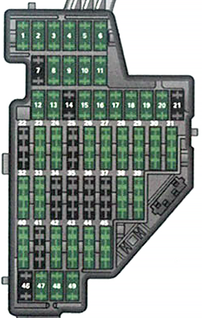 | 2 | Napęd na wszystkie koła, automatyczna skrzynia biegów, jednostka sterująca transmisją danych CAN (bramka), elektromechaniczny układ kierowniczy, wyświetlacz przełożenia automatycznej skrzyni biegów, przekaźnik silnika, jednostka sterująca zbiornikiem paliwa, jednostka sterująca ABS, ASR, ESP, przełącznik świateł | 10A |
