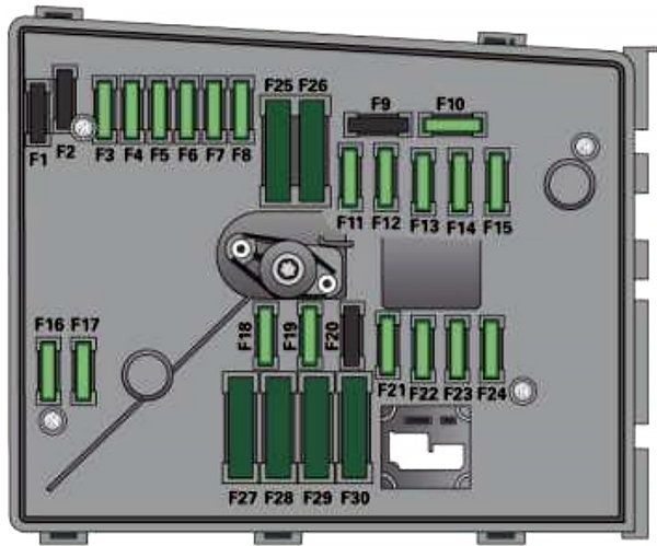 | F25 | Oświetlenie lewe (sterownik zasilania pokładowego) | 30A |