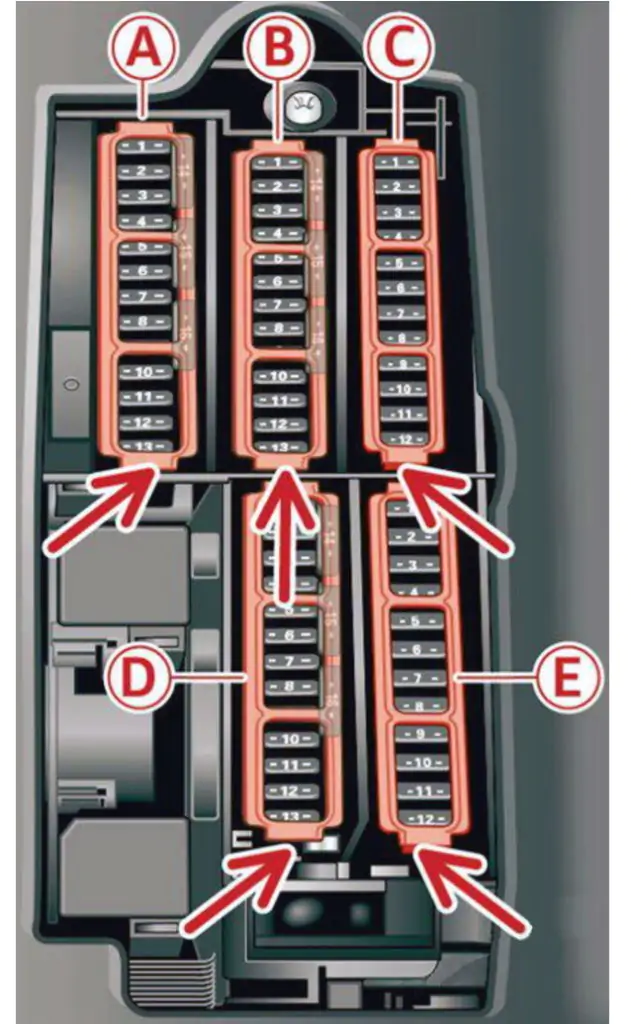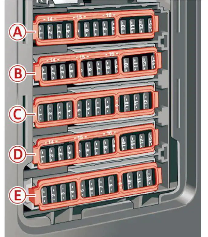Cel bezpieczników i przekaźników może różnić się od pokazanego na ilustracji i zależy od roku produkcji, wyposażenia elektrycznego oraz regionu dostawy Twojego Audi A5 F5.