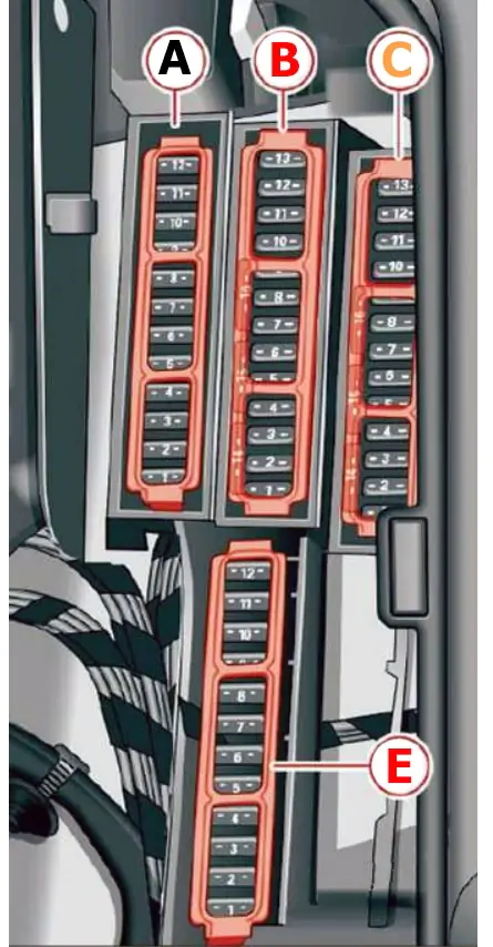 Wewnątrz pojazdu skrzynka bezpieczników i przekaźników znajduje się po lewej stronie pod deską rozdzielczą.