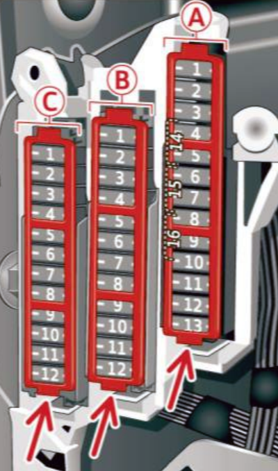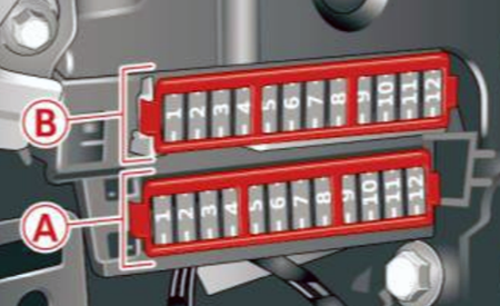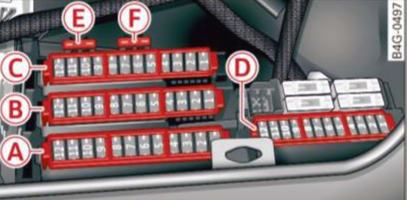 Lokalizacja skrzynek, schematy bloków bezpieczników elektrycznych w samochodach Audi A6 / S6 (C7/4G) (lata modelowe 2012, 2013, 2014, 2015).