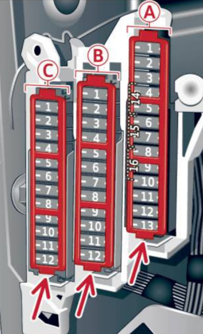 Lokalizacja skrzynek, schematy bloków bezpieczników elektrycznych w samochodach Audi A6 / S6 (C7 / 4G) (lata modelowe 2016, 2017, 2018).