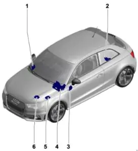 | 6 | 5 | Czujnik deszczu i światła -G397- Wzmacniacz telefonu komórkowego -R86- Uchwyt telefonu komórkowego -R126- Moduł dachowy przedni -WX3- |