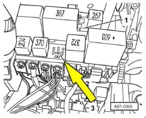 | 3 | Przekaźnik zasilania Motronic – J271 (silniki benzynowe) Przekaźnik bezpośredniego wtrysku Diesel – J322 (silniki Diesla) Przekaźnik ABS – J64 (automatyczna skrzynia biegów – 01J) |