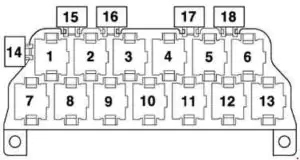 | 14 | 10A oświetlenie wnętrza, lampki do czytania, alarm ostrzegawczy, lusterko w osłonie przeciwsłonecznej, pamięć fotela |