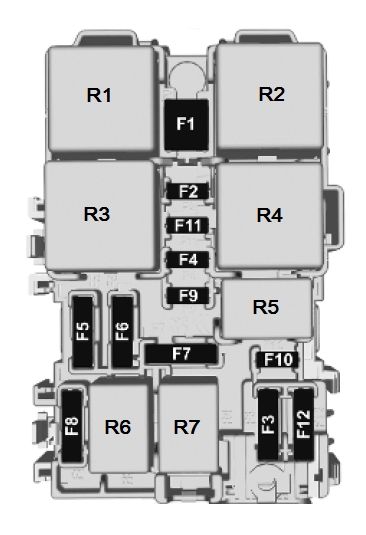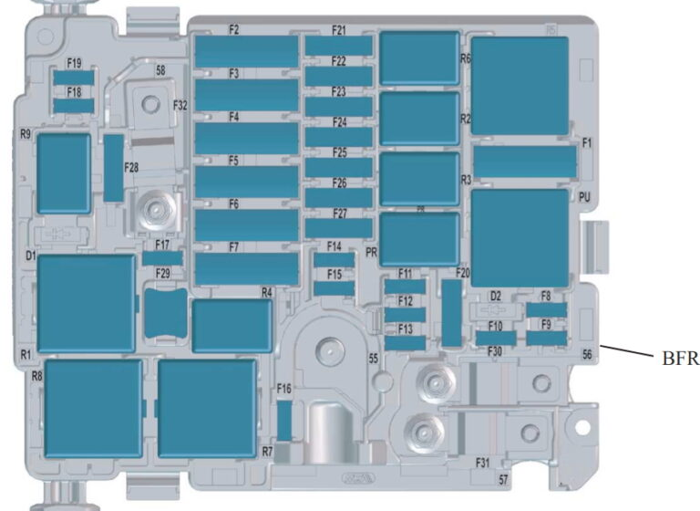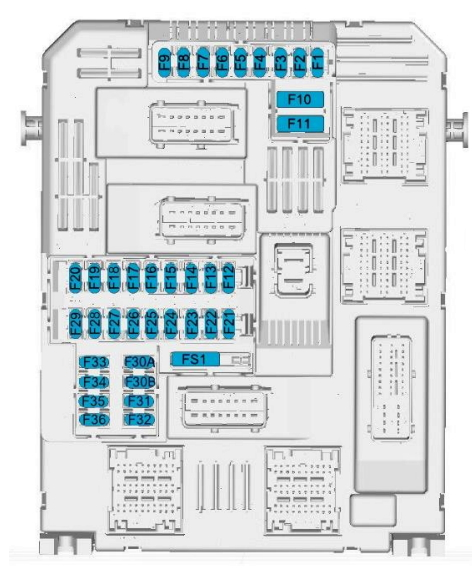 | F27 | Inteligentny moduł przełączający 25A (światło mijania prawe – światło cofania prawe – światło przeciwmgielne lewe – światło pozycyjne tylne lewe – trzecie światło stopu). |