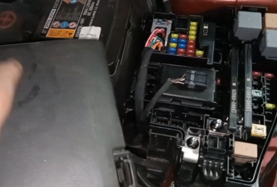 Pod maską, w komorze silnika, po lewej stronie znajduje się blok bezpieczników i przekaźników, przykryty pokrywą ochronną.