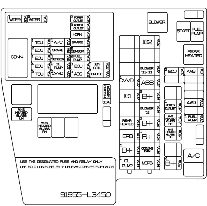 | B+1 | Blok złączy ICU 50A (bezpiecznik – P/SEAT (kierowca), P/SEAT (PASS), ZABEZPIECZENIE PRZED DZIEĆMI, MODUŁ 1, S/HEATER (RR), ZABEZPIECZENIE P/WINDOW (lewa strona klamki), ZABEZPIECZENIE P/WINDOW (prawa strona klamki)) |