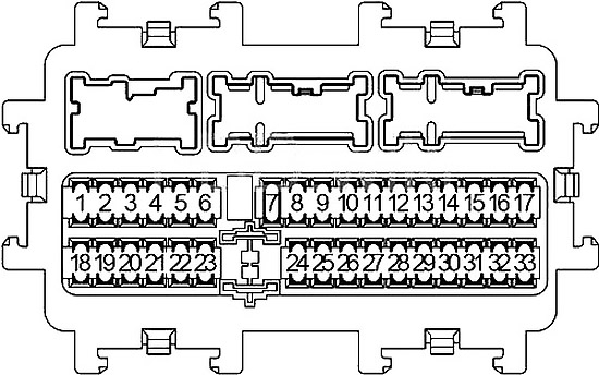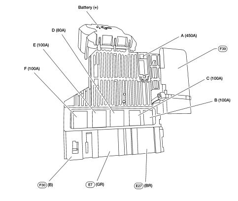 | C | 100A Przekaźnik pomocniczy (bezpieczniki: „13”, „14”, „15”), przekaźnik odmrażacza tylnej szyby (bezpieczniki: „10”, „11”, „12”), przekaźnik ogrzewania (bezpieczniki: „7”, „17”), przekaźnik wycieraczek przednich, prawy reflektor, prawy tylny reflektor, prawe przednie światło przeciwmgielne, bezpieczniki: „19”, „20”, „21”, „22”, „24”, „25”, „26” – „27”, „28”, „29”, „30”, „31”, „32”, „33”, „57”, „58”, „U” |