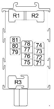| D | 100A Przekaźnik zapłonu (bezpieczniki: „56”, „61”, „63”, „65”, „67”), przekaźnik klimatyzacji, przekaźnik wentylatora chłodzącego silnik 1, lewy reflektor, lewe światło tylne, lewe przednie światło przeciwmgielne, bezpieczniki: „P”, „Q” |