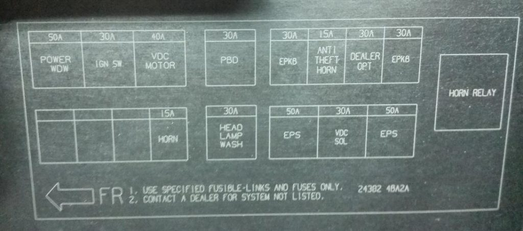 | 28 | 10A elektryczny hamulec postojowy, złącze diagnostyczne, napęd na 4 koła, przełącznik oświetlenia deski rozdzielczej, przekaźnik szyb, przekaźnik składania lusterek, przekaźnik otwierania lusterek | |