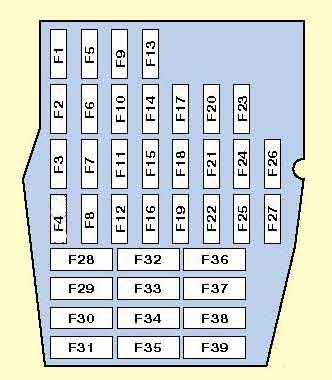 | F2 | (30A) Przekaźnik silnika wentylatora chłodzącego (bez klimatyzacji) |