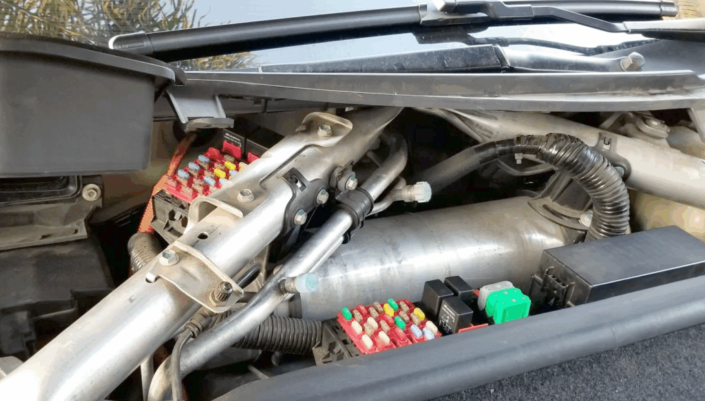 Z przodu samochodu, pod maską znajdują się 3 główne skrzynki bezpieczników i przekaźników.